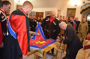 В Храме казаки выстроились в две шеренги про правую и левую стороны. О. Павел-духовный наставник казаков хутора «Николаевский» провел молебен, после которого к казакам и гостям обратился атаман хутора Александр Сехин, он сказал, что сегодняшнее событие можно считать историческим в жизни общества. «Иметь Боевое Знамя-это высокая честь. Вокруг него происходит единение всех казаков, сплочение общества, как перед всеобщей святыней-символом доблести, чести и традиции предков, их славного боевого прошлого». Затем начался обряд освящения знамени. На серебряном подносе вынесли три позолоченных гвоздя и специальный молоточек. Право прибить знамя к древку предоставляется участнику Великой Отечественной войны, девяносточетырехлетнему Киру Ивановичу Кадкину, следом за ним молоток берет председатель Совета стариков хутора подъесаул Василий Подкопаев, затем председатель Совета стариков районного общества подъесаул Иннокентий Бориско. Наступает время освящения боевого знамени и герба.